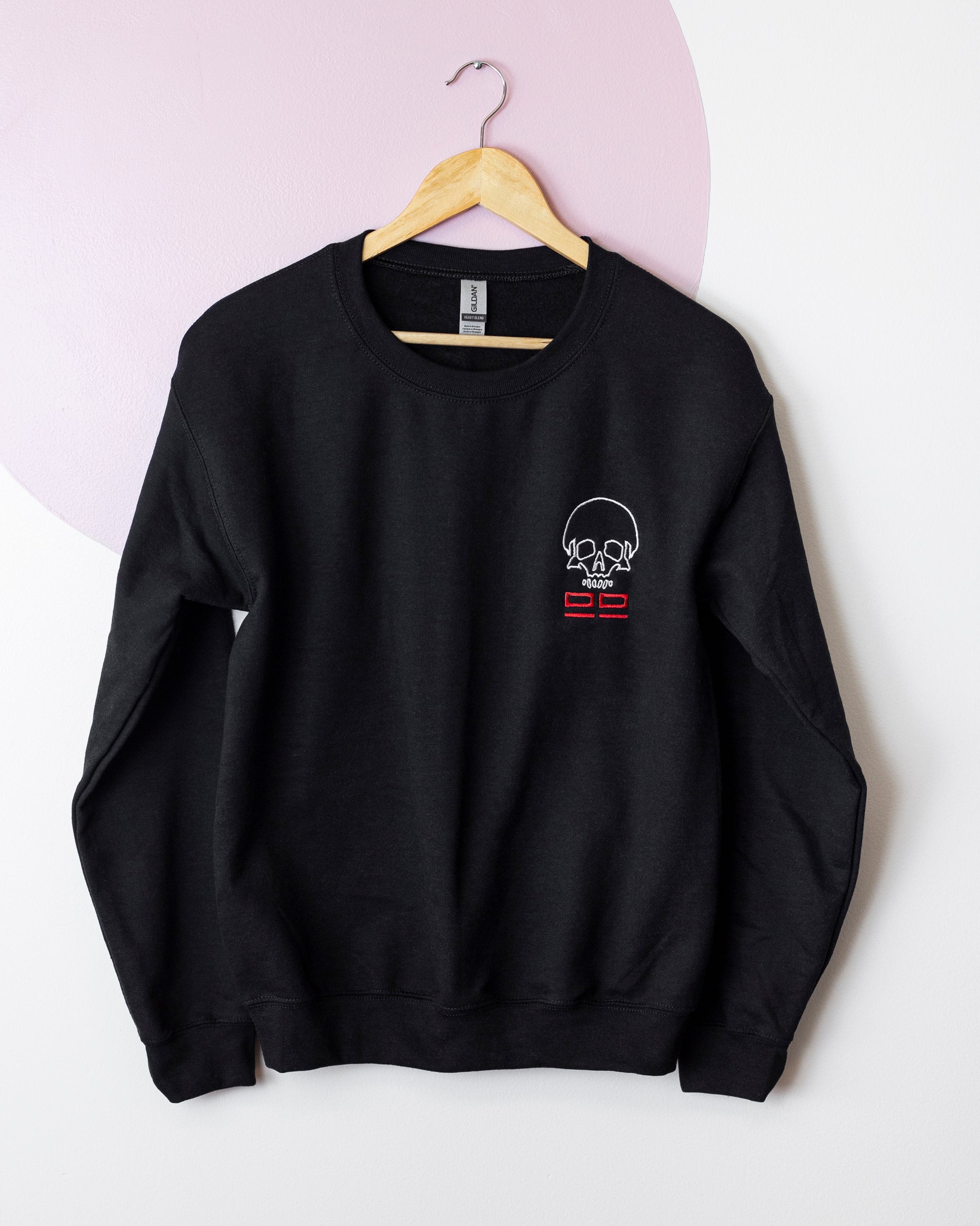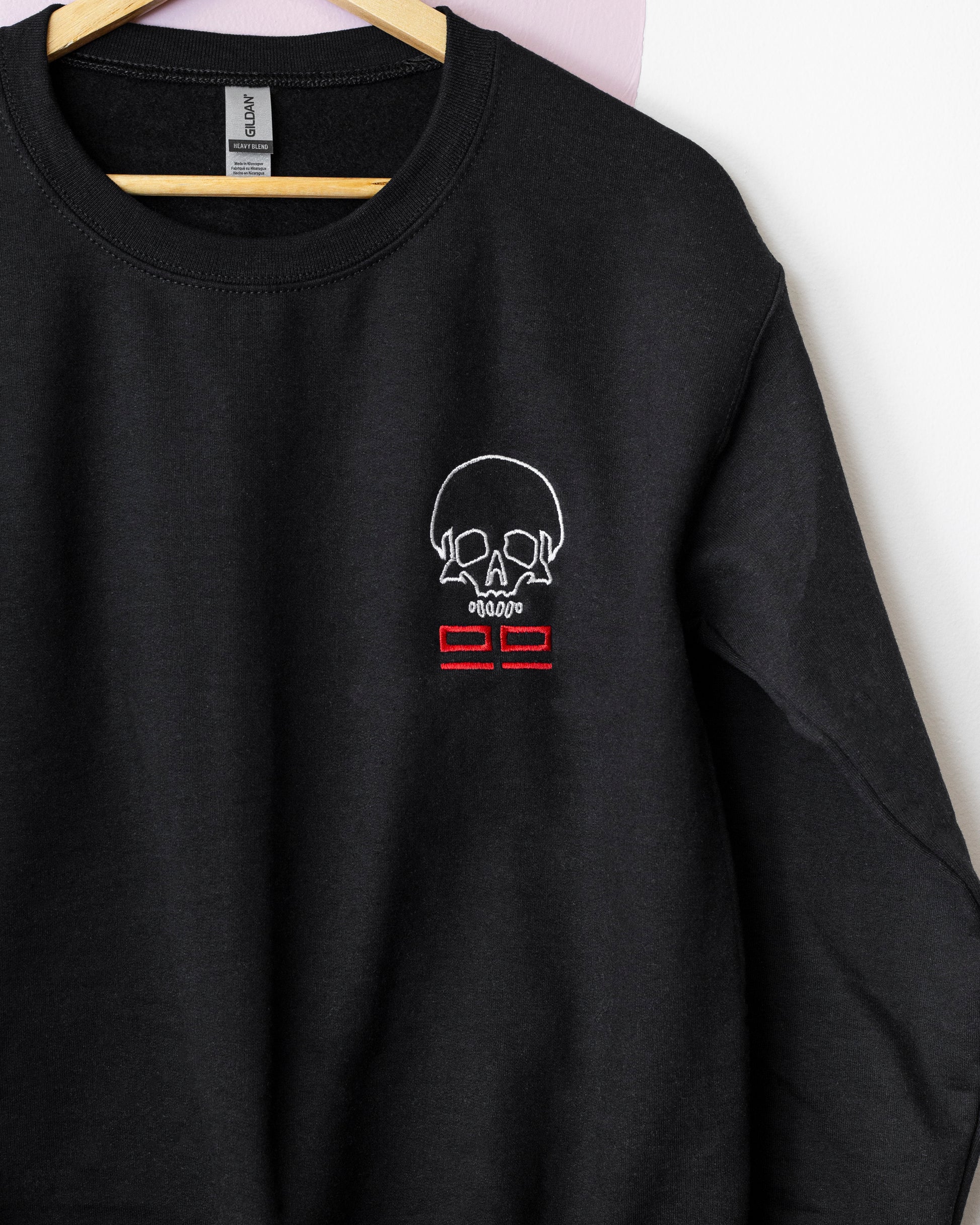 The Clone Force 99 Logo is embroidered with white and red thread on a black Gildan Heavy Blend 18000 Pullover Sweatshirt, black Comfort Colors Heavyweight Tee, or Comfort Colors Boxy Tee.