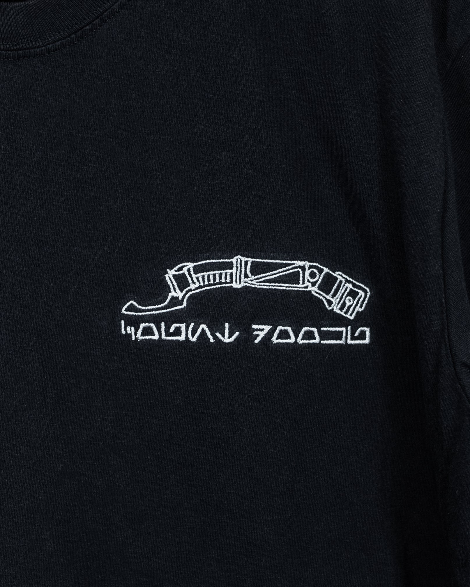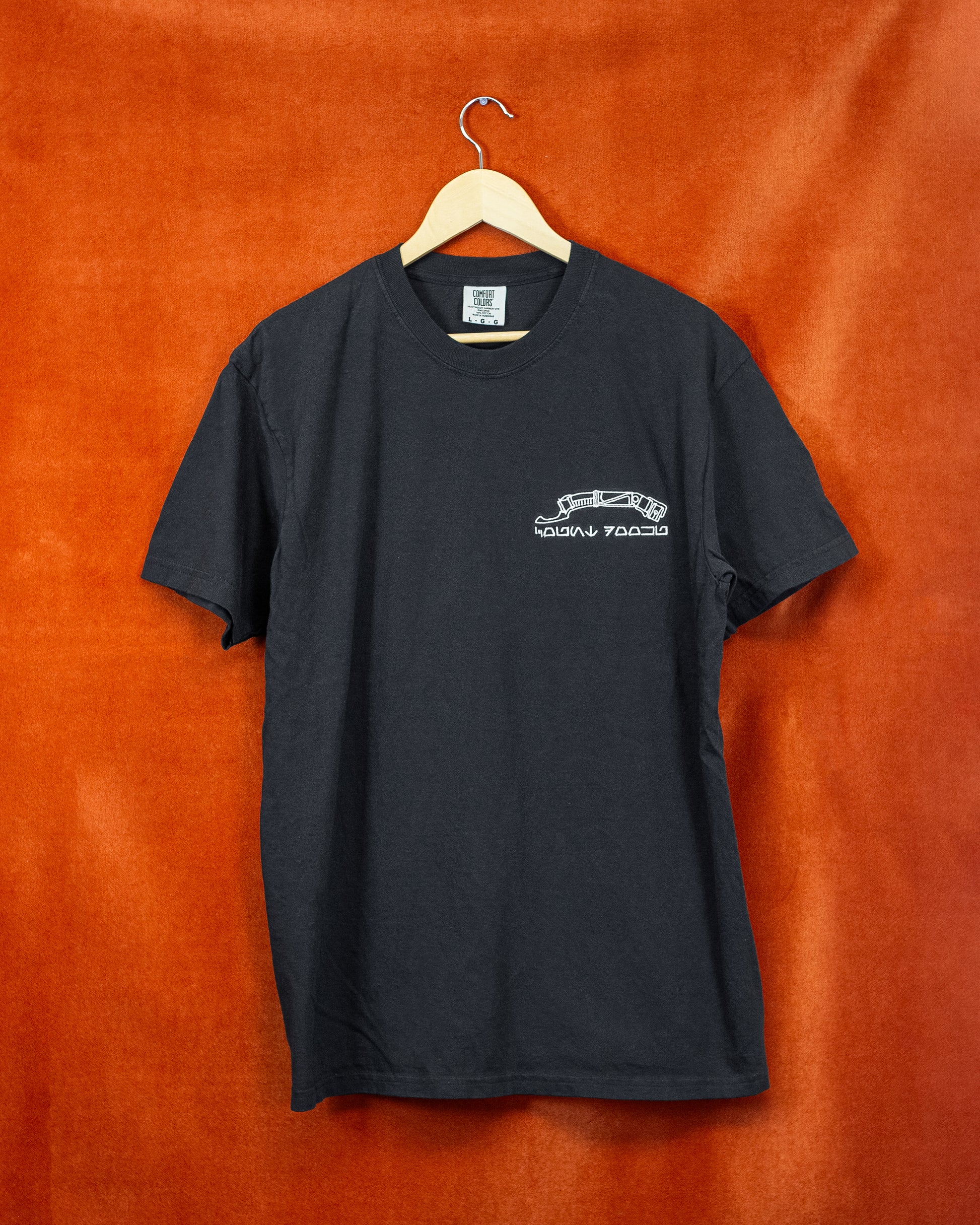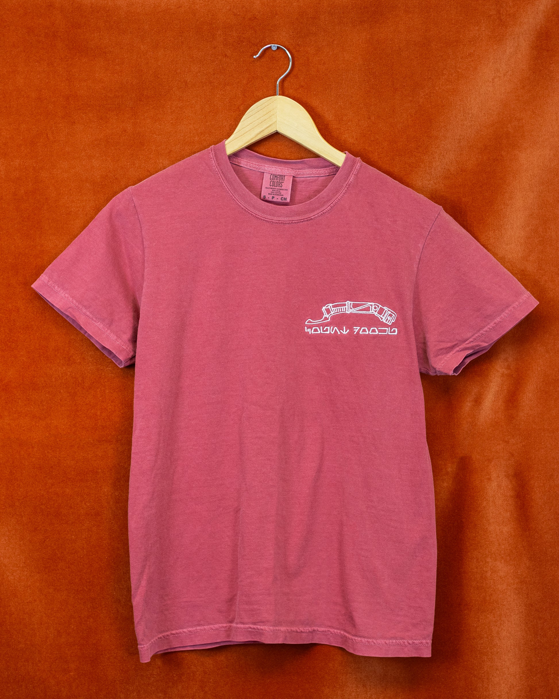 Count Dooku's saber with Aurebesh underneath. Embroidered with white thread on a red or black Comfort Colors Heavyweight Tee.