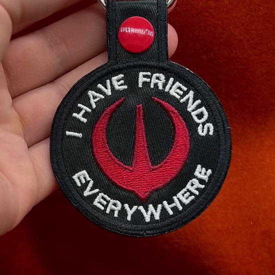 Single sided embroidered design with a red snap close clasp. Comes with a split ring.