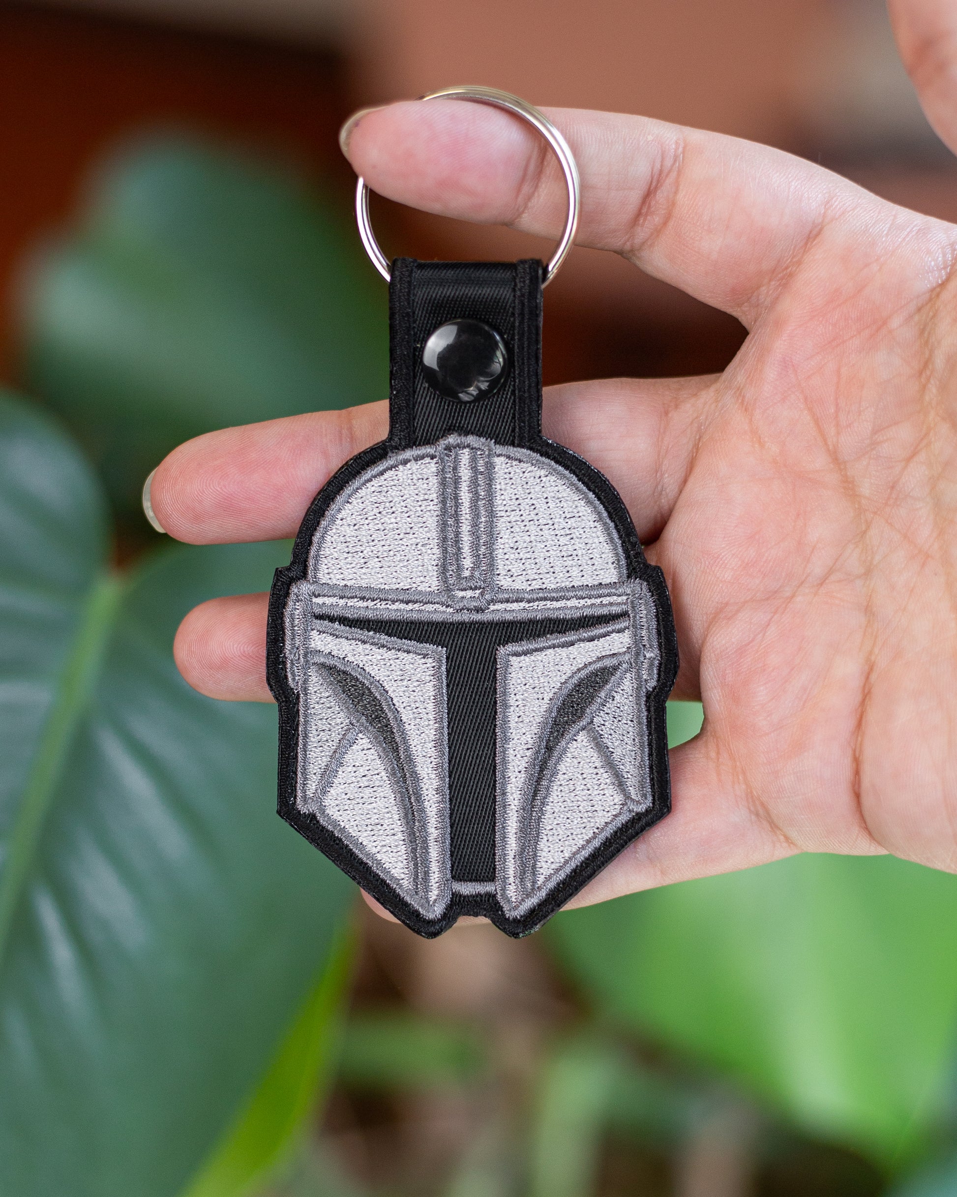 Single sided embroidered helmet design with a dark gray snap close clasp. Comes with a split ring.
