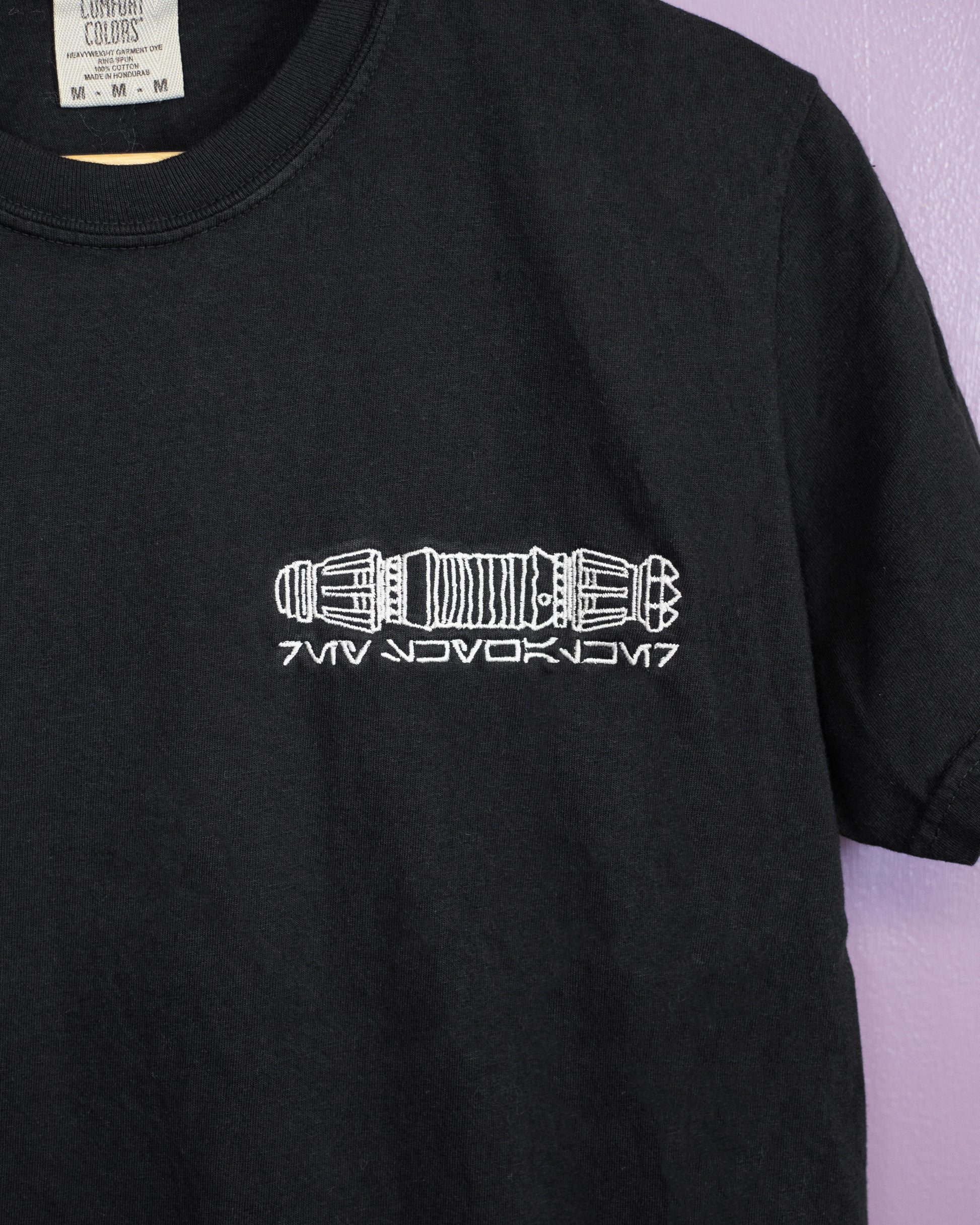 Rey's lightsaber with Aurebesh beneath. Embroidered with white thread on a yellow or black Comfort Colors Heavyweight tee.