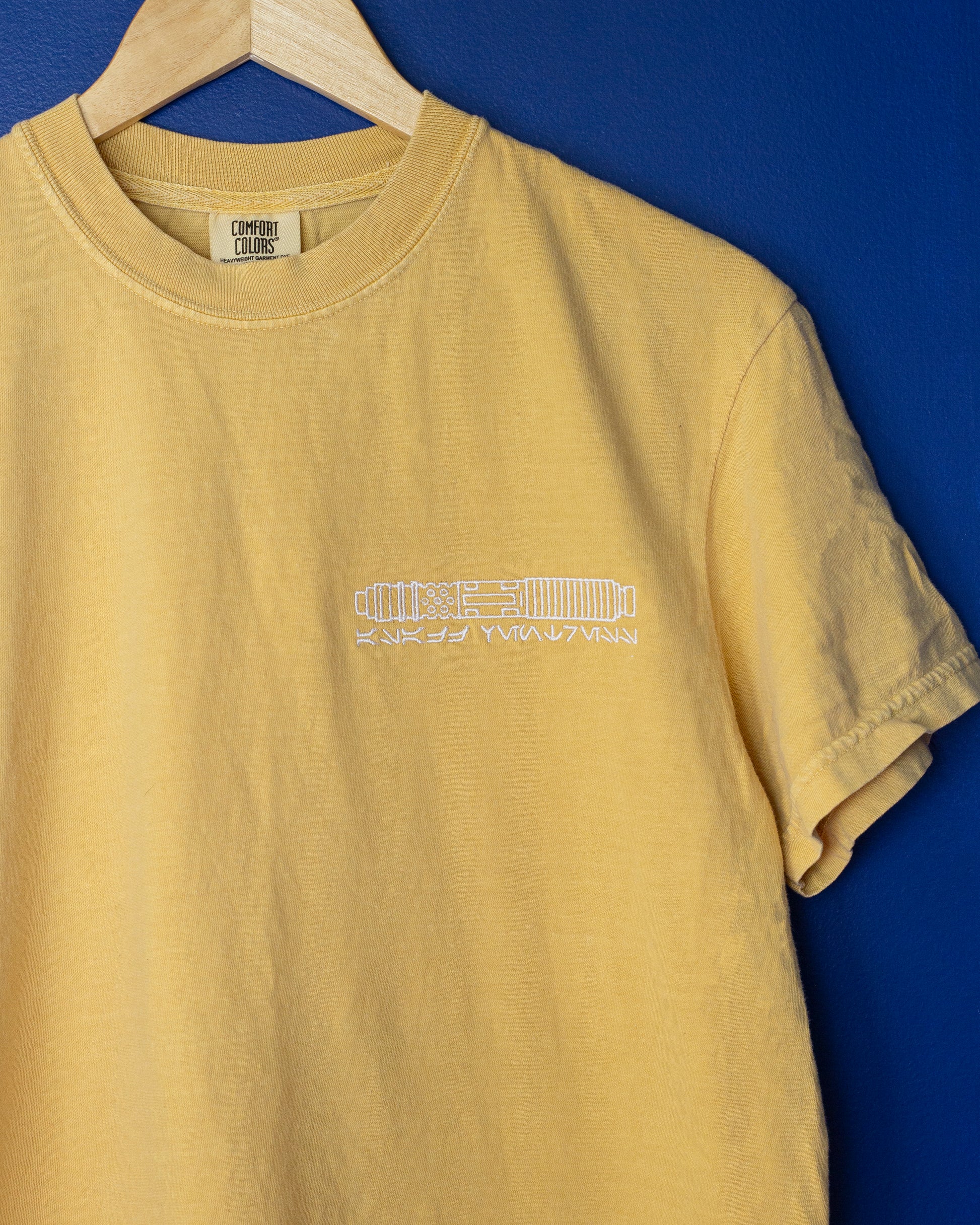 Embroidered with white thread on a yellow or black Comfort Colors Heavyweight tee with her name in Aurebesh underneath